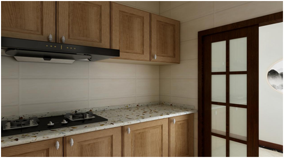 整體櫥柜實用為主,地面、墻面與頂面都以淺色調(diào)為主,搭配上深色櫥柜門板,顯得穩(wěn)重大氣。冰箱放到了廚房北側(cè)的陽臺上,這樣就能在廚房做更多的櫥柜,地柜與吊柜都做成了滿L形,極大限度的利用了廚房的空間,拓展了其儲物功能。