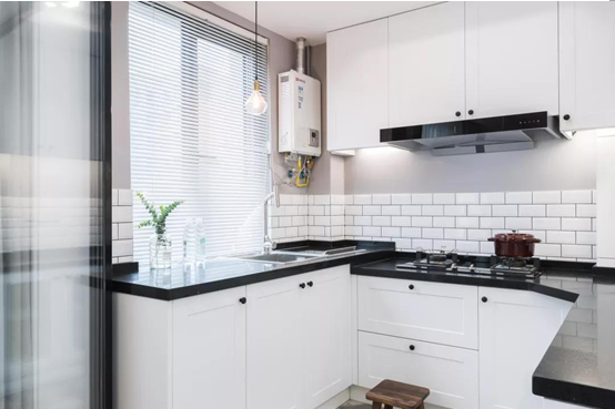 △用折疊式玻璃門將廚房和餐廳隔開,玻璃門既阻擋了油煙的蔓延,又保證了廚房的采光通透性,有利于做飯時家人之間的溝通。廚房門旁邊的仙人掌在空間上也起到了一定的隔斷作用。廚房內(nèi)部是U字型的櫥柜布局,白色的柜體、黑色的臺面、小白磚、灰色墻漆的運(yùn)用,讓廚房層次分明,折疊門的使用也讓廚房平時更顯寬敞。