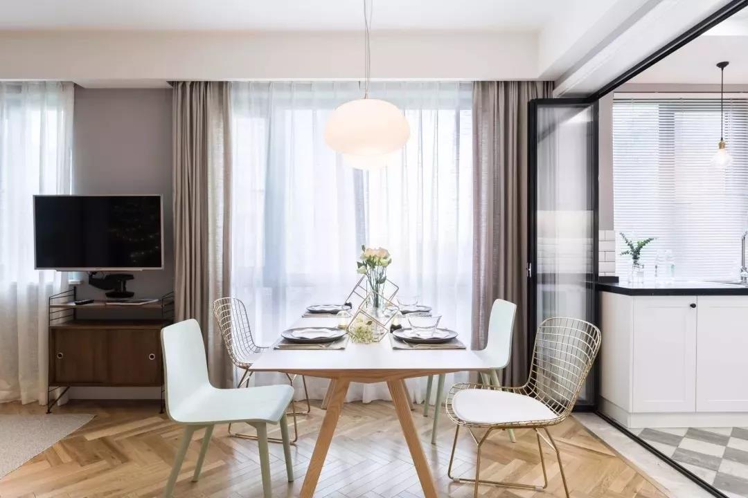 餐桌和餐椅的顏色選取上,吊燈的造型上,都是典型的北歐風(fēng)格。鐵藝餐椅、塑料餐椅和原木餐桌結(jié)合,線條流暢,搭配兩盞暖色的吊燈,給人一種精致優(yōu)雅而又溫馨的感覺。