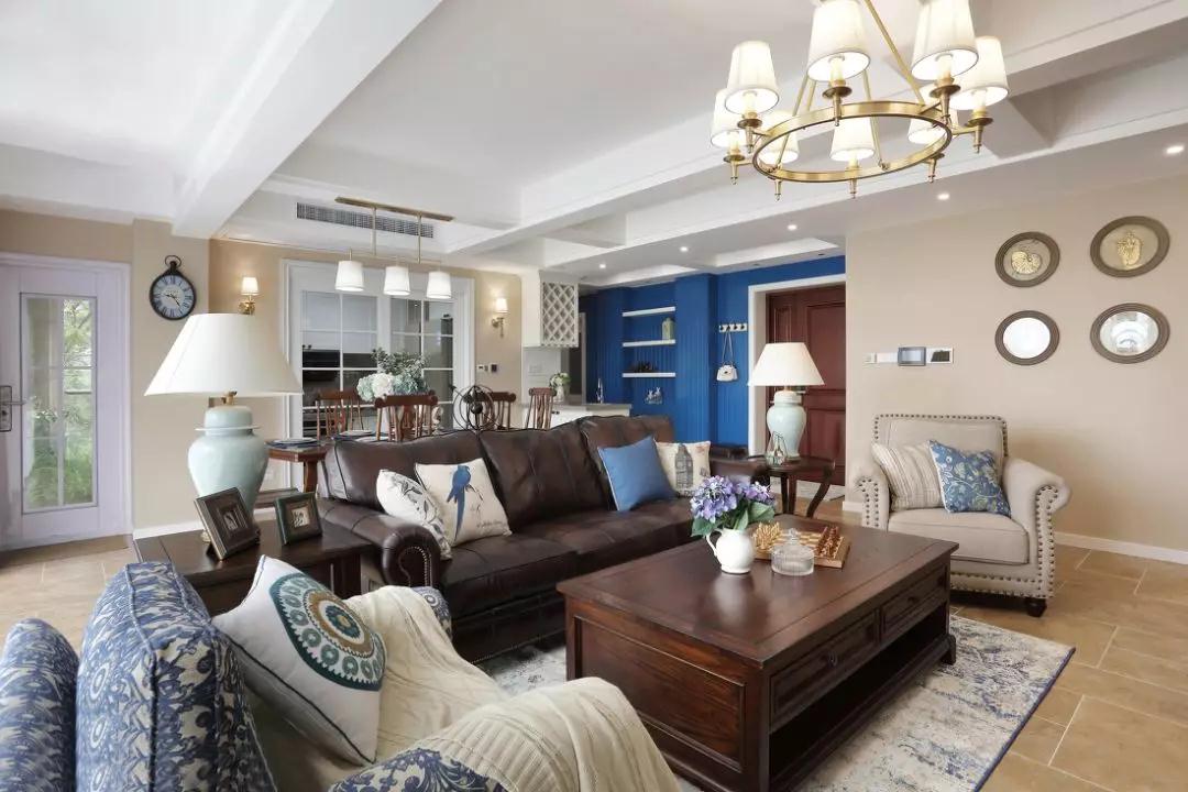 藍(lán)色在沙發(fā)、抱枕、地毯及墻面上小面積出現(xiàn),增添空間活力。