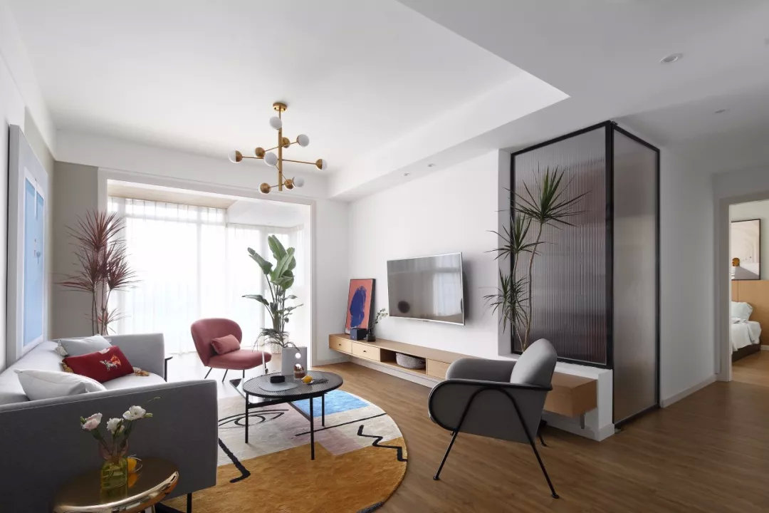 客廳的后方是次臥,加上磨砂的玻璃讓光線能夠流通起來。木色的電視柜和綠植給客廳增添了一些自然感,加上金屬質(zhì)感的吊燈顯得更為優(yōu)雅。